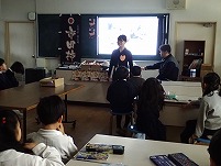 授業は、JAみなみ信州の葉勢森さんとJA全農長野大阪事務所の鶴田さんが講師となられ、長野県についてや市田柿についてを紙芝居やクイズ形式で学習。低学年の子供たちにも歴史ある市田柿を知ってもらうため、わかりやすく工夫された形の楽しい授業が行われました。中には柿を干して食べる事を初めて知った児童もおり「しょっぱいの?甘いの?食べるのが楽しみ」と微笑ましい声も。最後には全農長野のマスコットキャラクター信州力も登場して「信州力くん、どうやって来たの?車で来たの?」と1年生らしく可愛らしい会話が飛び交いました。